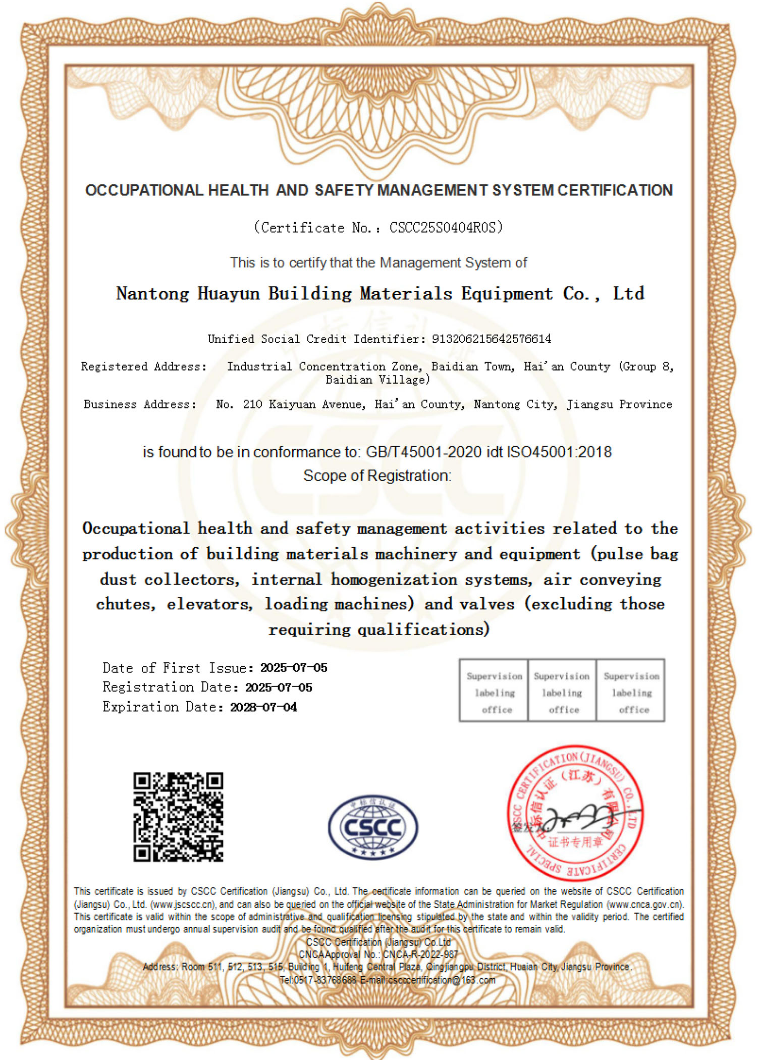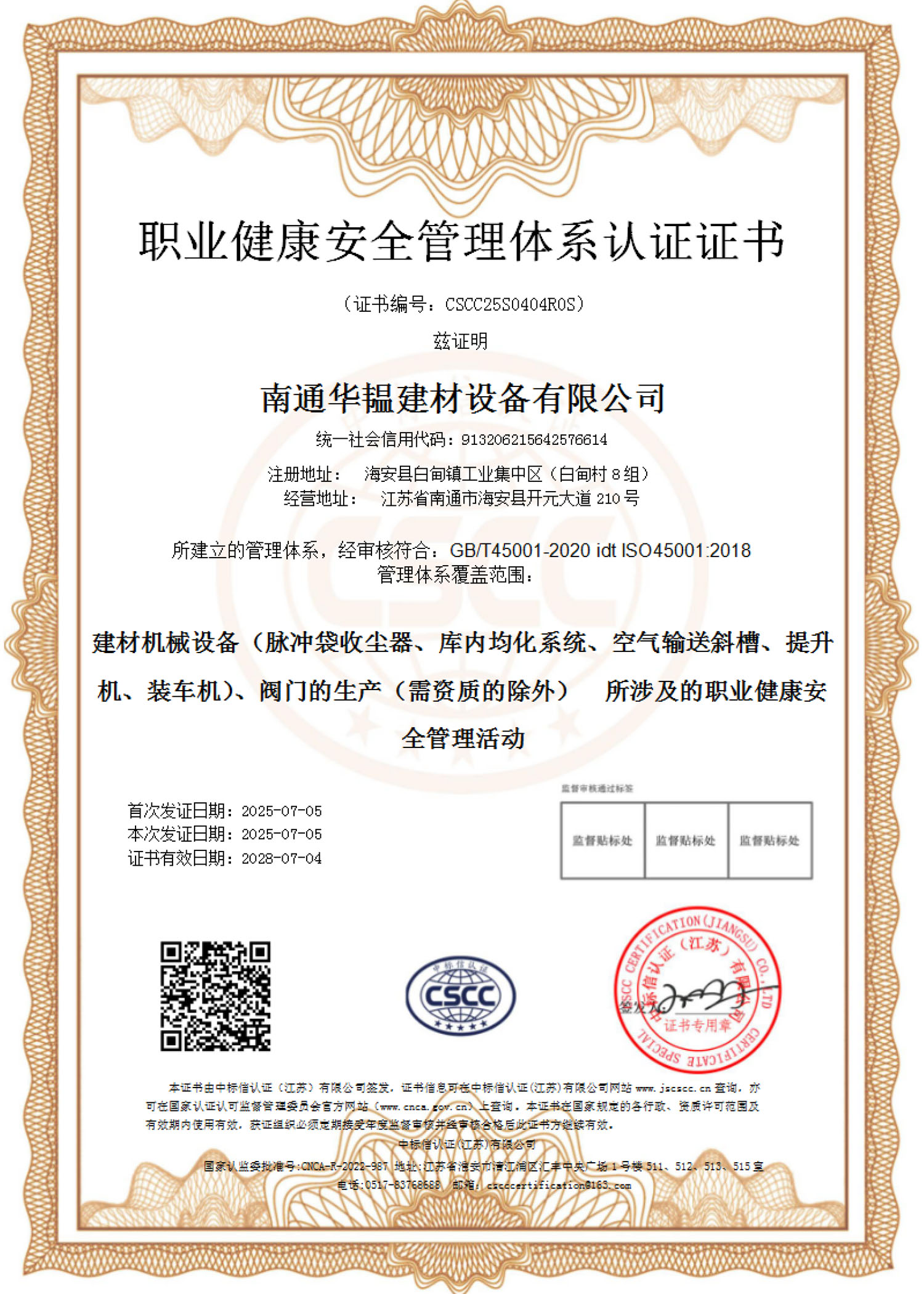 职业健康安排管理体系认证证书